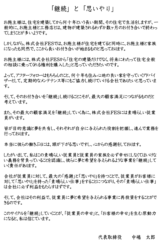 経営理念|横浜市で一戸建てをお考えなら|神奈川県 保土ヶ谷区|地域密着の工務店株式会社FES