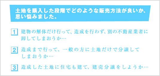さて、土地を購入した段階でどのような販売方法が良いか、思い悩みました。
